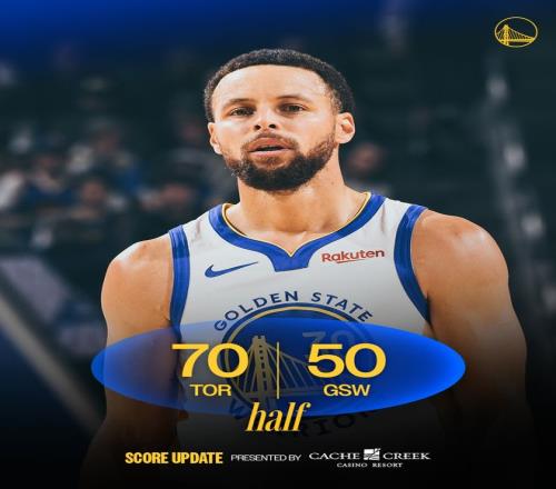 猛龙队的奎克利上半场得到18分,巴恩斯得到14分、4个篮板和6次助攻,马姆科拉什维利得到11分和8个篮板;勇士队的库里得到12分,佩顿得到9分。